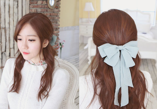 Bước 3: dùng 2 dây vải của bộ tóc giả choàng ngược chiều nhau sau đó siết chặt, có thể thắt nơ cho thêm thẩm mỹ, nếu bạn muốn giấu sợi dây đó thì có thể dùng các loại dây cột tóc loại to hoặc loại kẹp gấp, kẹp ngọc trai ... để che phủ bên ngoài phần dây cột.