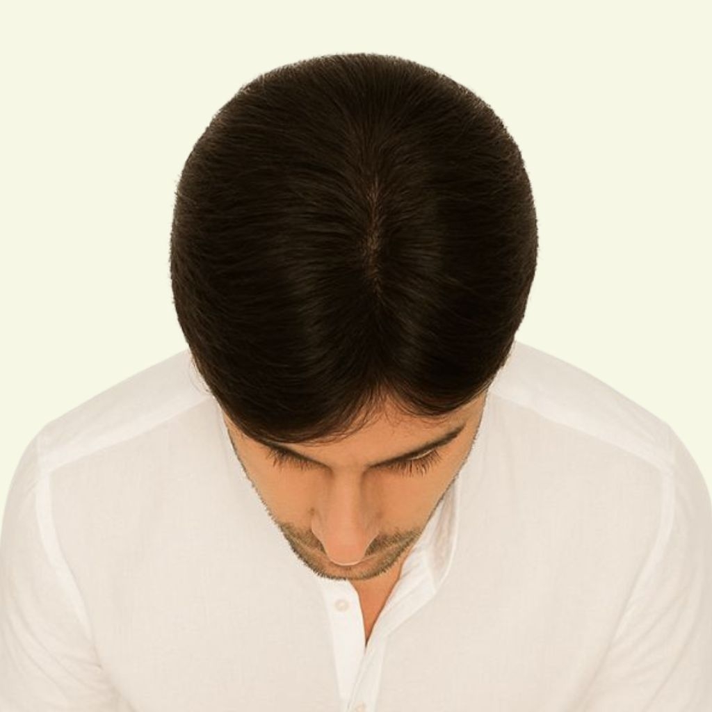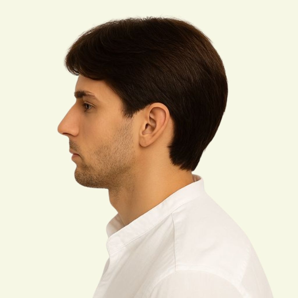 Thiết kế tóc giả nam nguyên đầu hai mái ôm sát khuôn đầu, dễ dàng tạo nhiều kiểu tóc nam tính và phù hợp với mọi gương mặt.